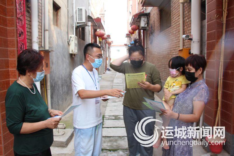 ▲8月20日,闻喜县兴闻西街社区居委会工作人员,在向居民宣传防范网络电信诈骗有关法律法规和知识。