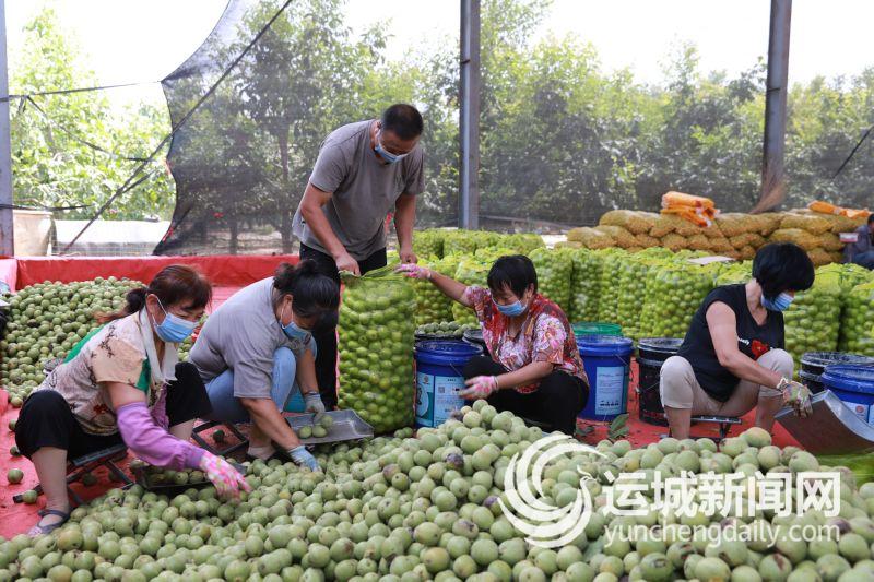 ▲8月20日,在河津市小梁乡马家庄村的核桃地里,村民们进行着青皮核桃的装袋、捆绑、搬运等工作。