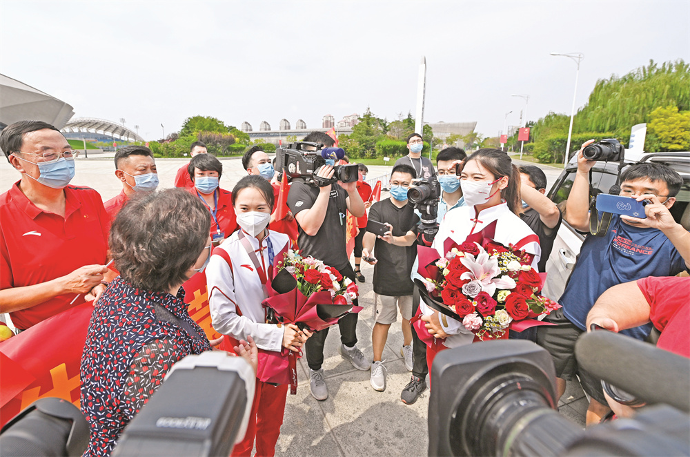 8月23日,朱雪莹(中左)和龙晓清(中右)手捧花束。 当日,天津市体育局在团泊体育中心举办活动,欢迎东京奥运健儿蹦床选手朱雪莹、射箭选手龙晓清凯旋回津。 新华社记者