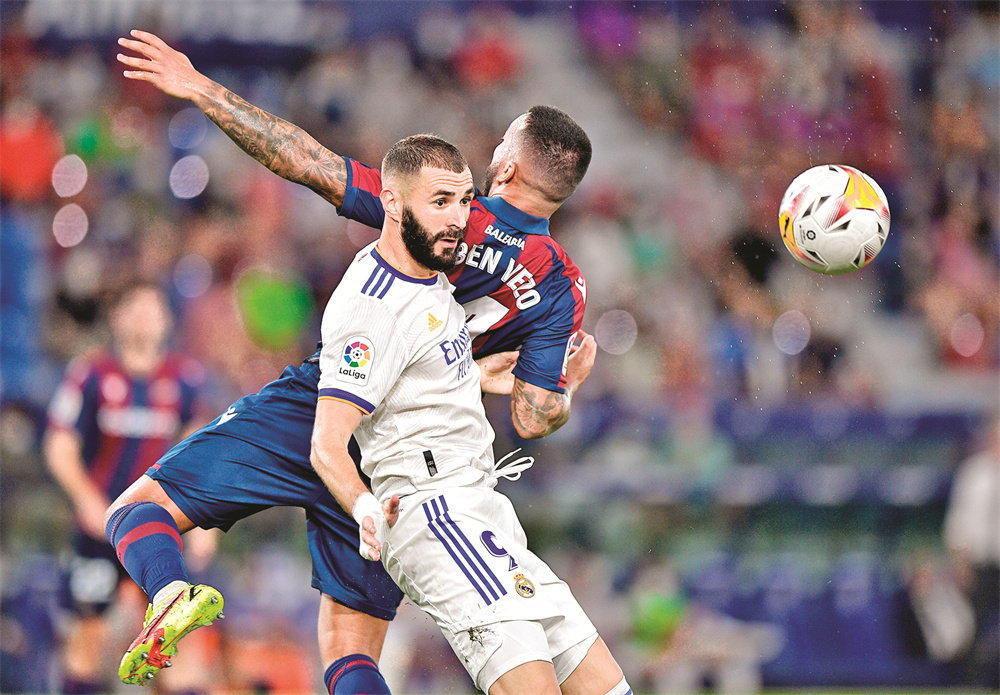 8月22日,皇家马德里队球员本泽马(前)和莱万特队球员韦佐在比赛中争顶。当日,在2021-2022赛季西班牙足球甲级联赛第二轮比赛中,皇家马德里队客场以3比3战平莱万特队。 新华社/路透