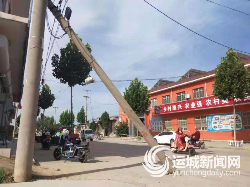 断裂的电杆位于夏县禹王乡大街,斜对面就是该县育博学校。电杆严重倾斜,仅靠顶部几根电缆勉强支撑才没有倒下。摇摇欲坠的电杆严重威胁到行人及车辆安全,希望有关部门尽快采取措施清除这一安全隐患。