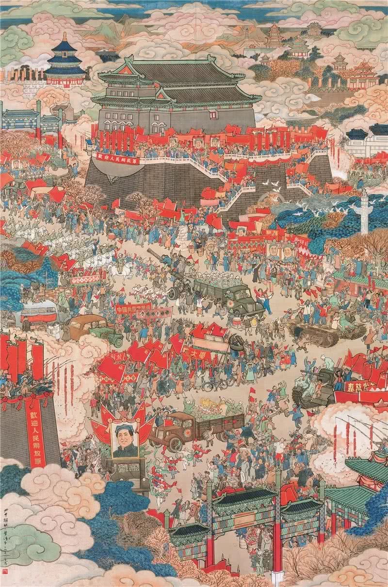 1959年,画家叶浅予根据人民解放军和平解放北平这一重要历史时刻,创作了美术作品《北平解放》。叶浅予先生以巨幅传统工笔年画的形式表现了1949年解放军进驻北平的场景。叶浅予先生是20世纪著名的中国人物画家,以漫画、舞蹈戏剧人物题材的中国画享誉画坛。在《北平解放》中,为成功表现出解放军进城万众欢欣、普天同庆的场面,他一反此前以写意为主的艺术风格,采用了中国工笔重彩画的表现方式。