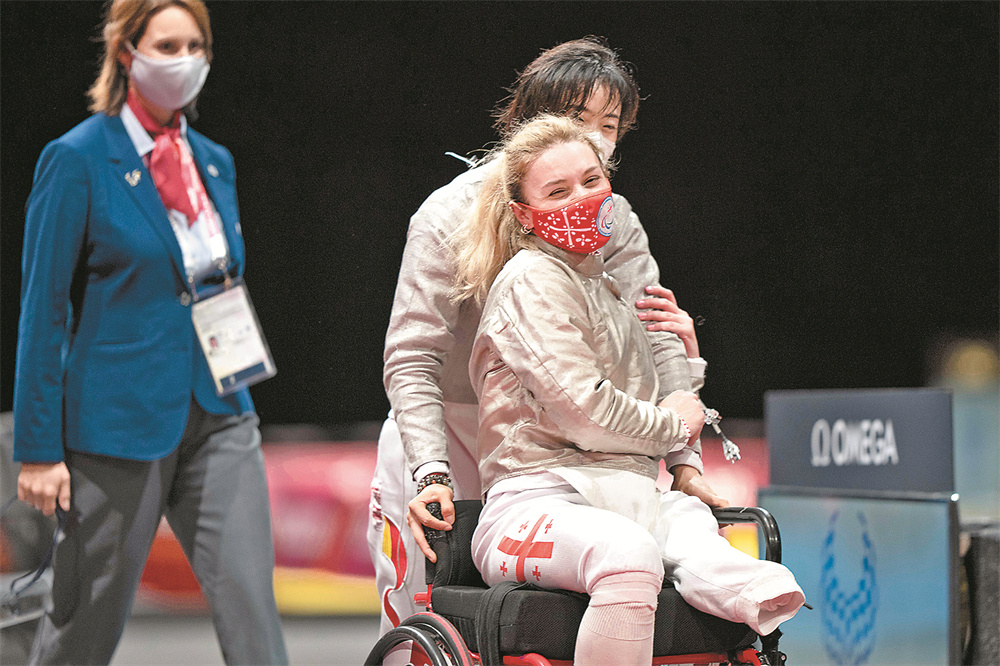 8月25日,中国选手边静(中)在获胜后推着格鲁吉亚选手妮诺(右)离开比赛场地。 当日,在东京残奥会轮椅击剑女子佩剑个人赛A级决赛中,中国选手边静战胜格鲁吉亚选手妮诺,获得金牌。 新华社记者 熊琦 摄