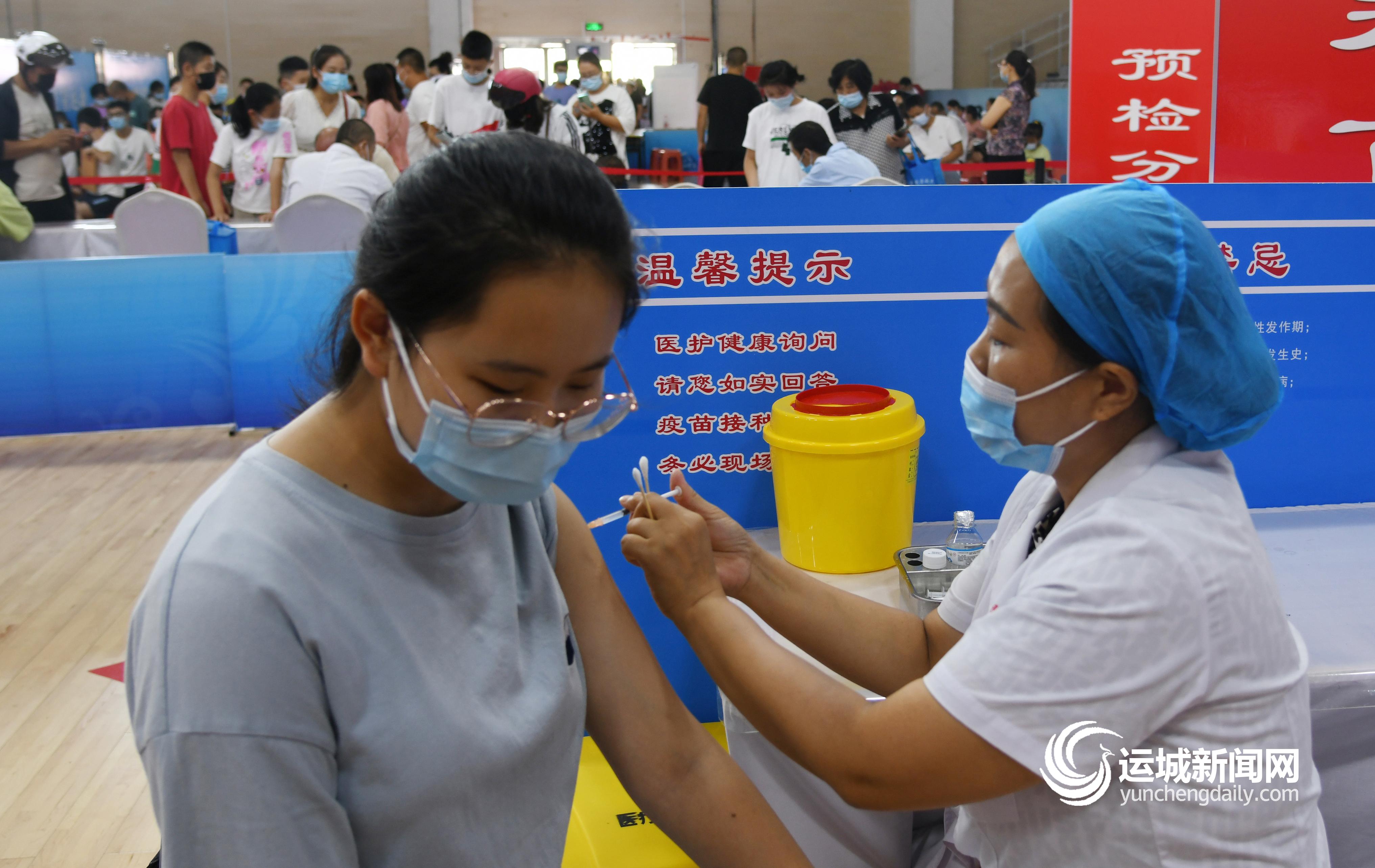 8月26日,在闻喜县体育馆新冠疫苗方舱接种点,医护人员在为12岁至14岁人群接种疫苗。