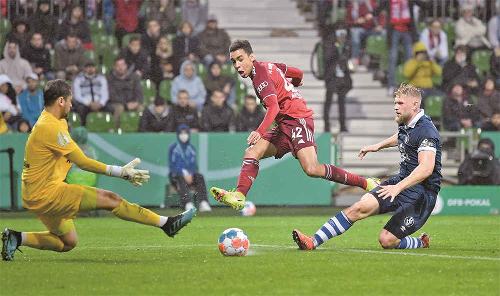8月25日,拜仁慕尼黑队球员穆夏拉(中)射门得分。 当日,在2021-2022赛季德国杯第一轮比赛中,拜仁慕尼黑队客场以12比0战胜SV不来梅队。 新华社/路透