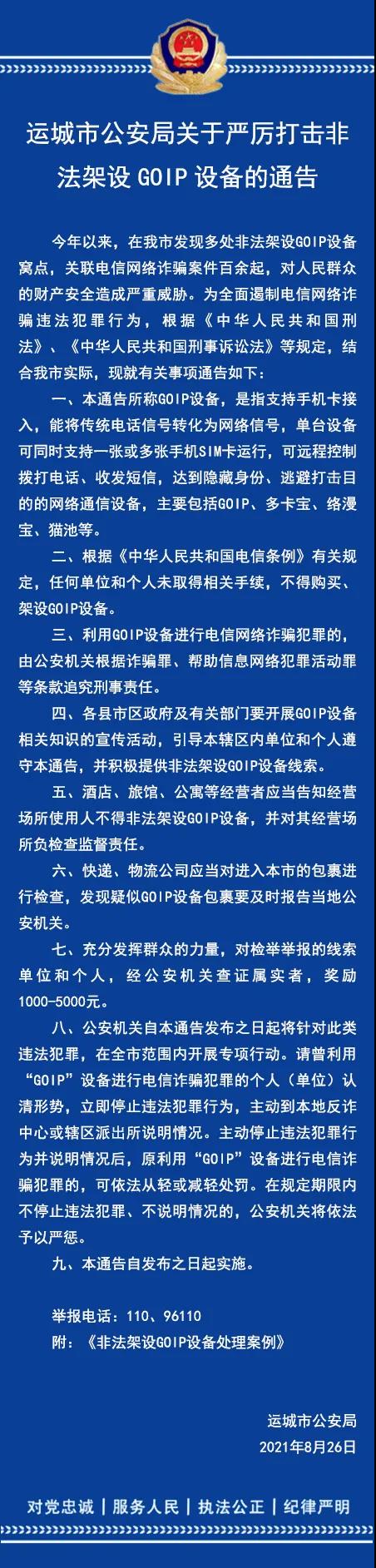 一、2021年5月3日,稷山县公安局成功抓获非法架设GOIP设备嫌疑人黄某(女),目前已被依法刑事拘留。经查,黄某在网上结实异性李某。李某与黄某谈情说爱骗取信任后以带黄某挣钱为由指使黄某在家中非法架设GOIP设备,该设备帮助境外诈骗窝点拨打诈骗电话,涉电信诈骗案件数十起。