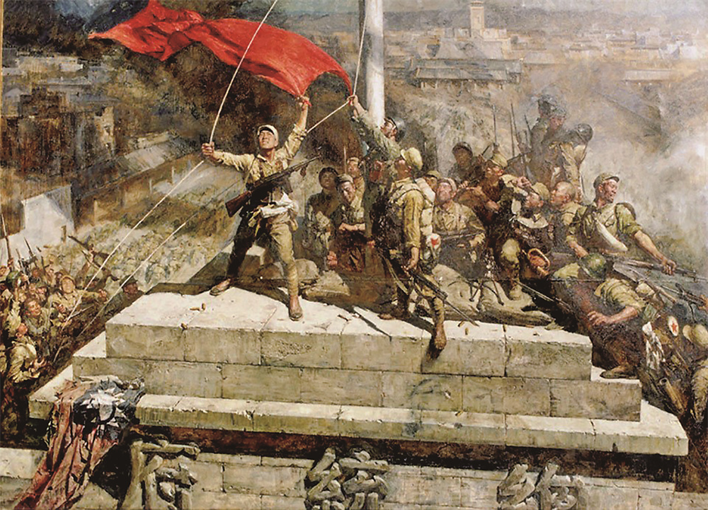 1949年4月22日,人民解放军一举越过长江天堑,势如破竹,向国民党统治中心南京及长江以南发起攻击。4月23日,南京宣告解放。人民解放军第八兵团一部攻占国民党总统府。解放军战士迅速登上总统府楼顶,把一面鲜艳的红旗高高升起。至此,统治中国22年之久的南京国民政府宣告灭亡,而一个代表人民的新政权即将诞生。1977年,陈逸飞、魏景山为中国人民革命军事博物馆解放战争馆陈列创作了油画《攻占总统府》。