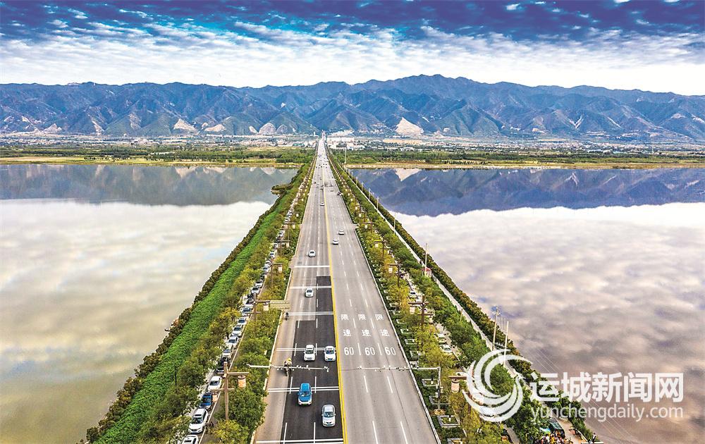 蓝天白云、巍巍中条,宽阔笔直的解放南路跨越浩浩盐池,构成了一幅人与自然和谐共生的生态美景。 记者 高志勇 摄