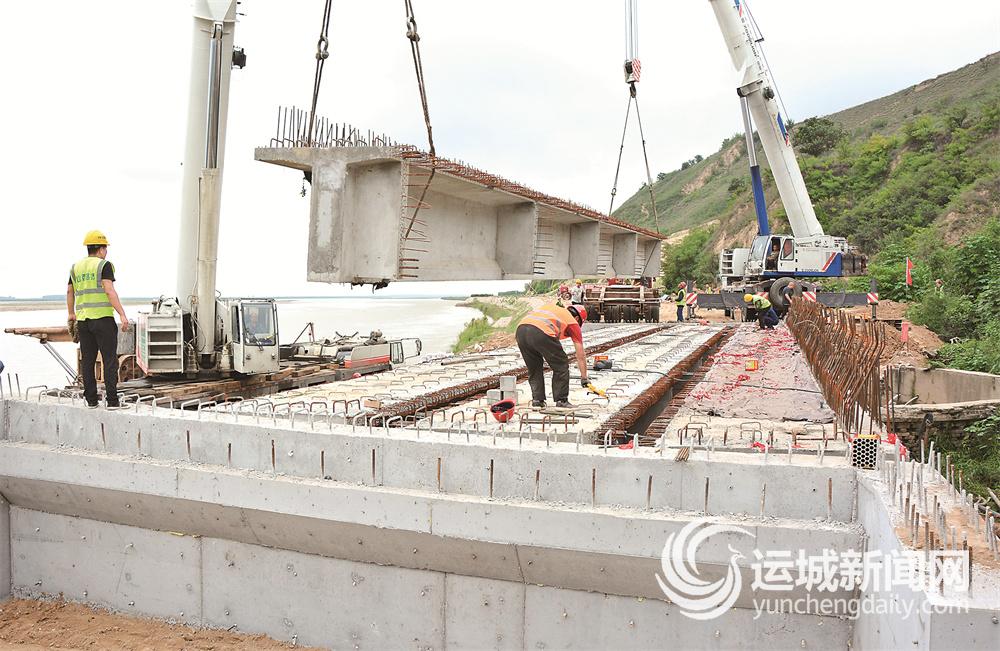 8月29日,黄河一号旅游公路芮城段凤凰咀桥施工现场,梁板架设顺利完成。
