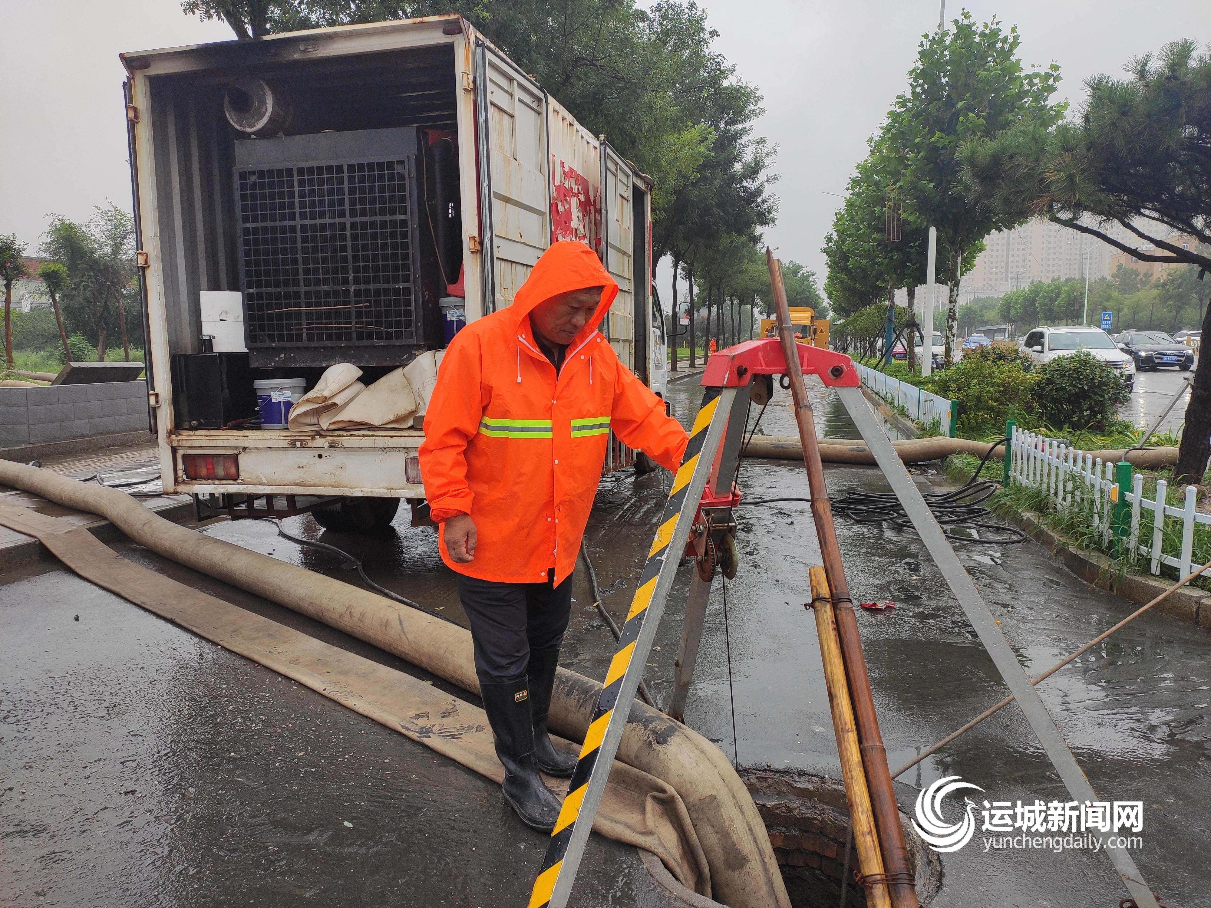 在市区学苑北路与大禹街交会处的易积水点,该中心提前两天安排泵车对排水管道进行抽排清空,以此来应对连续性降雨天气。降雨后,3辆移动泵车和9台移动防汛抢险泵,24小时不间断抽排,确保了该路段的正常通行。
