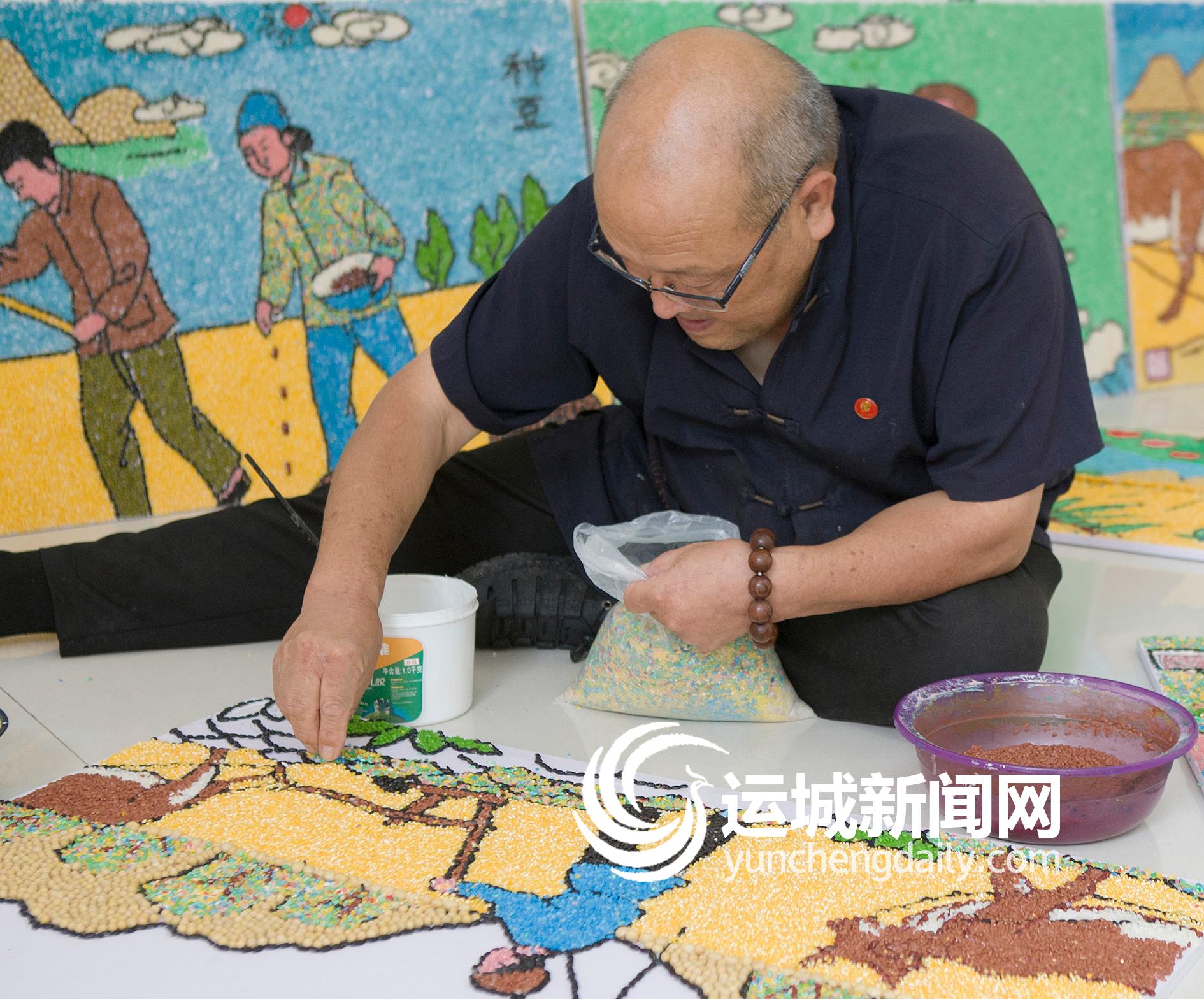 ▲9月1日,万荣县贾村乡大谢村农民谢孝发,在创作“喜迎丰收”主题粮食画。 在2021年中国农民丰收节即将到来之际,谢孝发和一批粮食画爱好者,以五谷杂粮为材料,构思创作出《大丰收》《无人机喷药》等16幅充满乡土气息的粮食画作品,表达农民对丰收的喜悦。这些作品将于丰收节期间展出。
