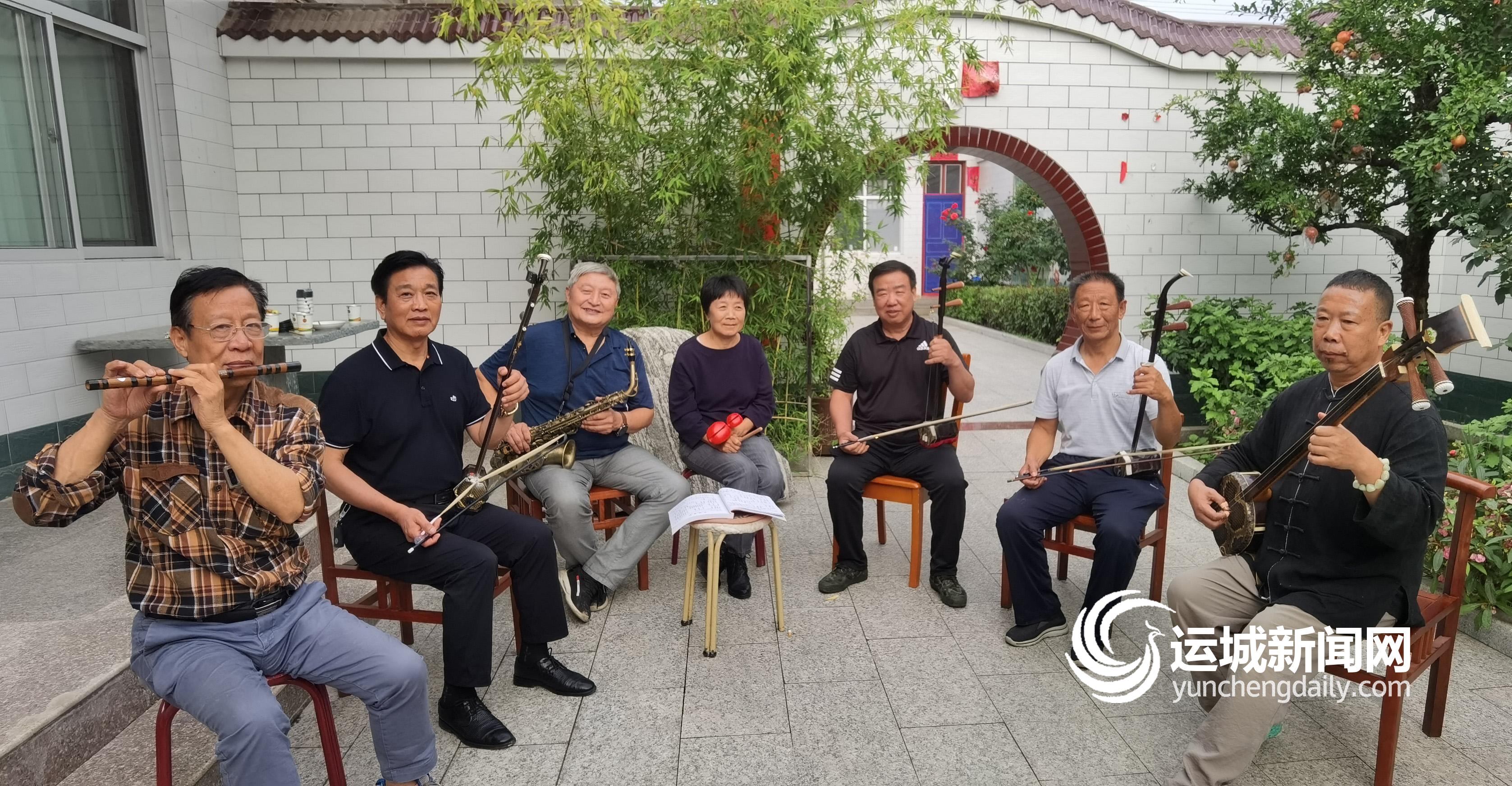 ▲8月29日,芮城县陌南镇曲里村一农家院内,几名退休人员有的拉二胡、有的吹笛子……共同演奏革命歌曲。
