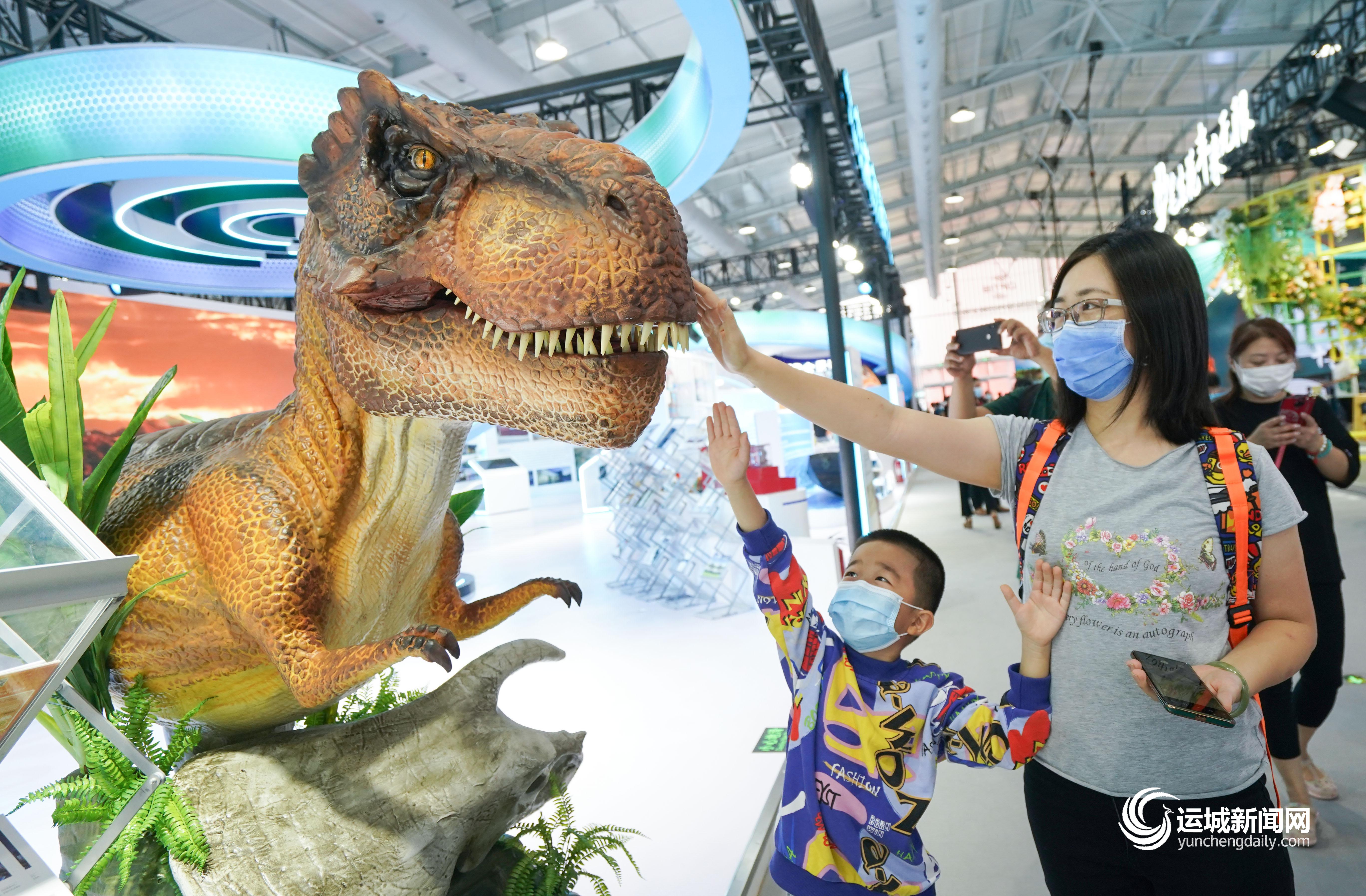 ▲9月4日,参会人员在服贸会首钢园区文旅服务展馆北京城市副中心展台参观仿真恐龙。