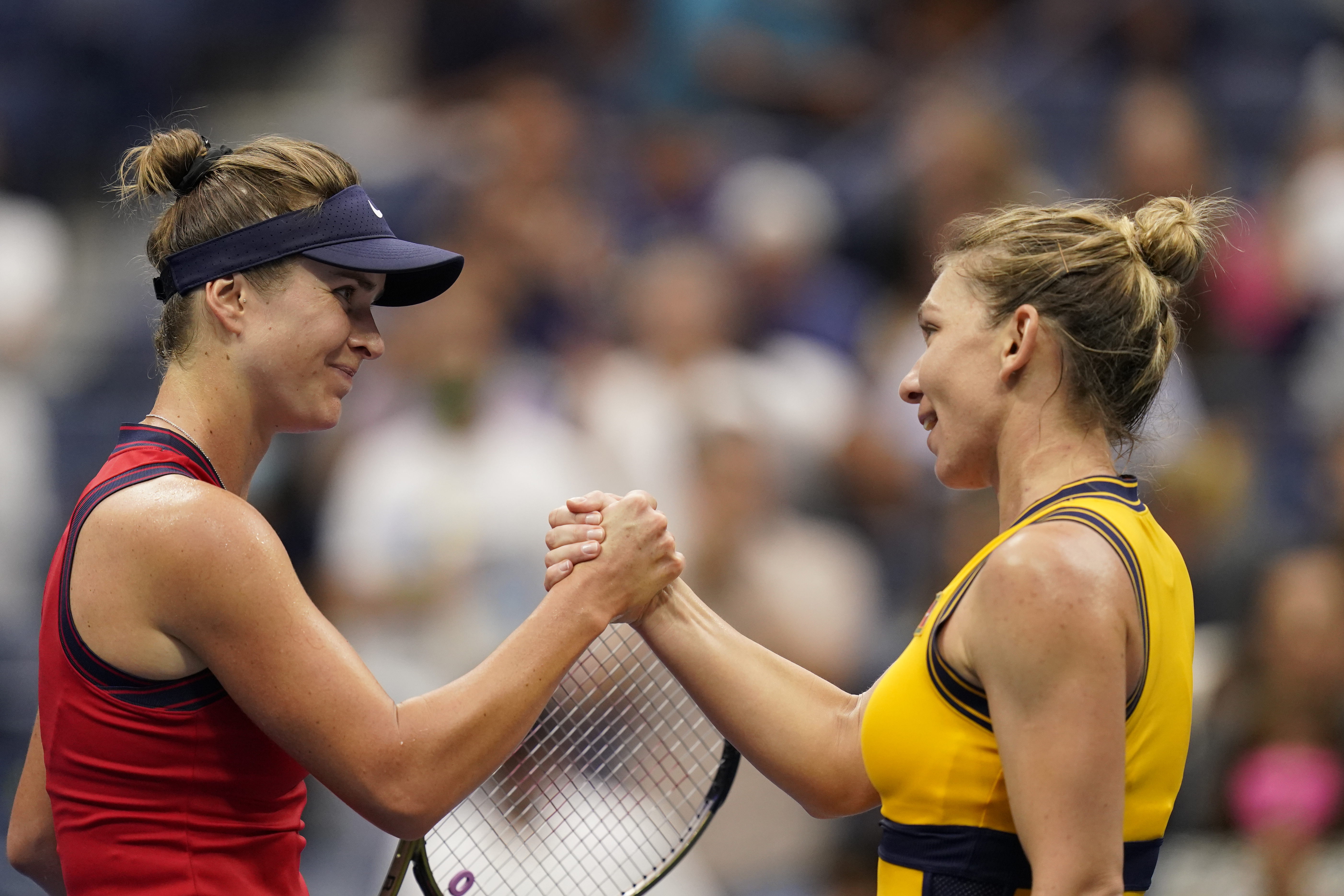 ▲9月5日,斯维托丽娜(左)赛后致意哈勒普。当日,在2021美国网球公开赛女单第四轮比赛中,乌克兰选手斯维托丽娜以2比0战胜罗马尼亚选手哈勒普,晋级八强。