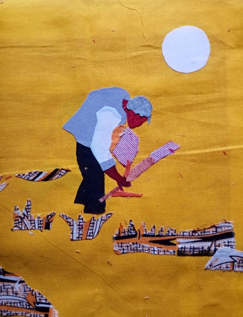 布贴画《母亲的丰收》中,伛偻低头拾麦穗的母亲,一步步拾起了掉在地上的麦穗。吉海奎用黄色布做底,表现一望无际的成熟麦田,再用黑白灰色调贴人,作品整体色彩明朗干练大气。在烈日之下,母亲弯着腰在麦茬地上仔细地捡麦穗,其姿态如山之稳,散发着日月同辉的光彩。作者有意把母亲的肤色处理为深褐色,借以表达母亲劳作的辛劳以及历经沧桑的人生。画面中心集中,感情充沛,让人回味无穷。