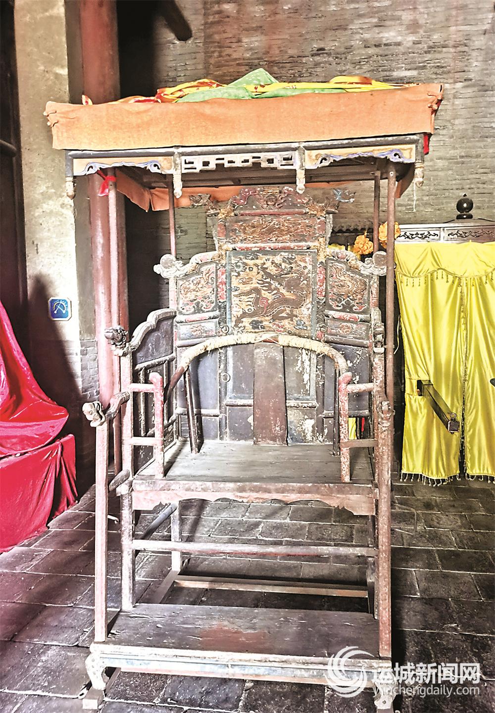 记者在现场看到,这顶轿子为木制结构,做工考究,轿顶有黄布遮盖,轿子靠背上描绘的龙纹彩绘清晰可见,脚踏中间部分还有踩出来的印记。李成晋介绍,这也表明了这顶轿子应是专门放置关老爷坐像的。