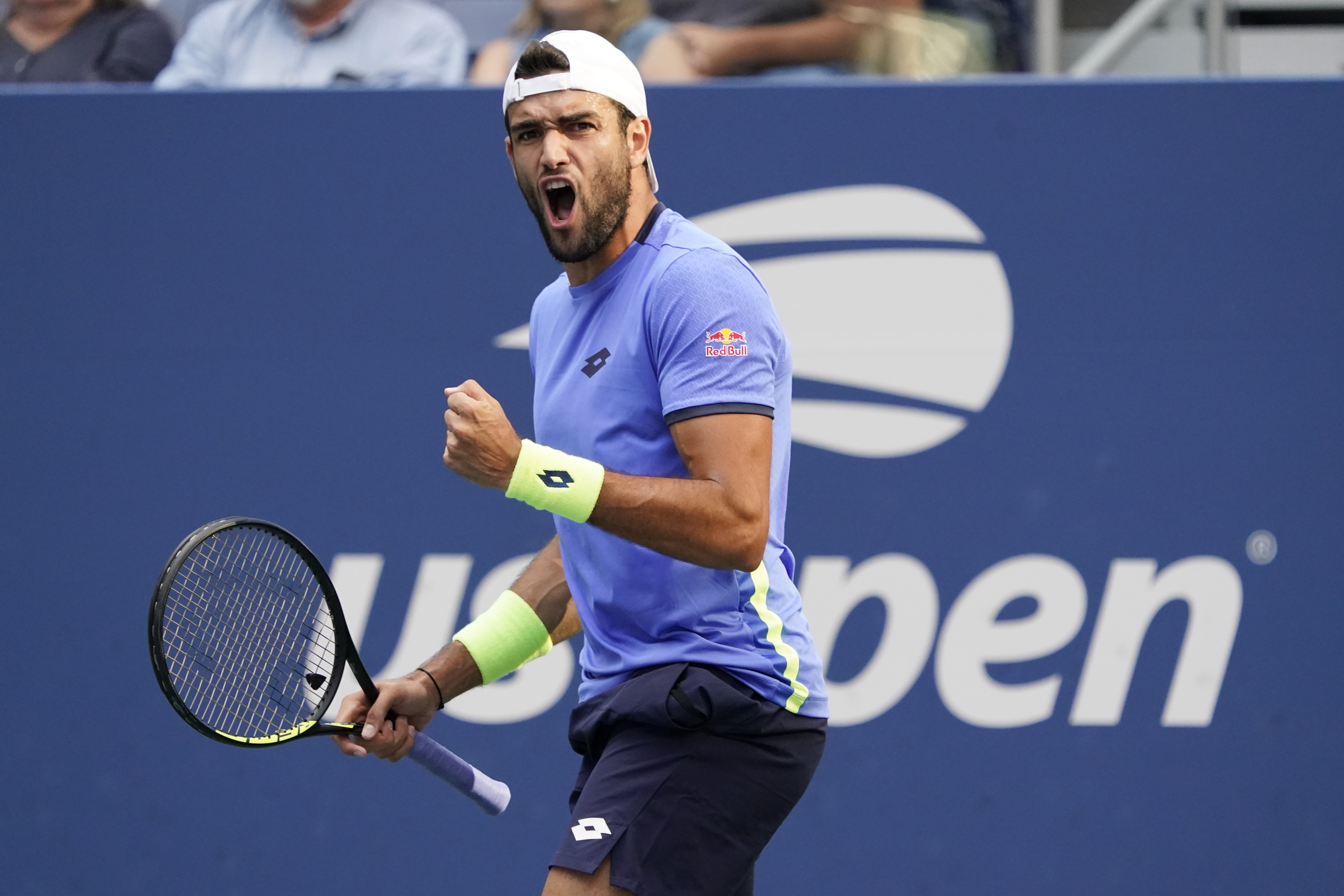 ▲9月6日,贝雷蒂尼在比赛中庆祝得分。当日,在2021美国网球公开赛男单第四轮比赛中,意大利选手贝雷蒂尼以3比1战胜德国选手奥特,晋级八强。 新华社/美联