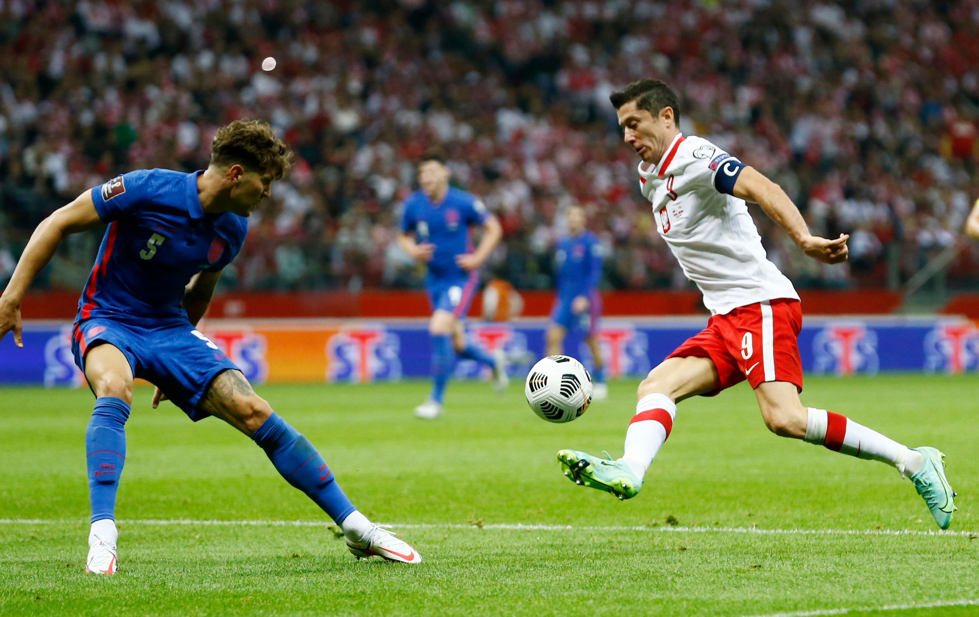 ▲9月8日,英格兰队球员斯通斯(左)与波兰队球员莱万多夫斯基在比赛中拼抢。当日,在波兰华沙进行的2022年卡塔尔世界杯预选赛欧洲区小组赛I组比赛中,英格兰队客场以1比1战平波兰队。 新华社/路透