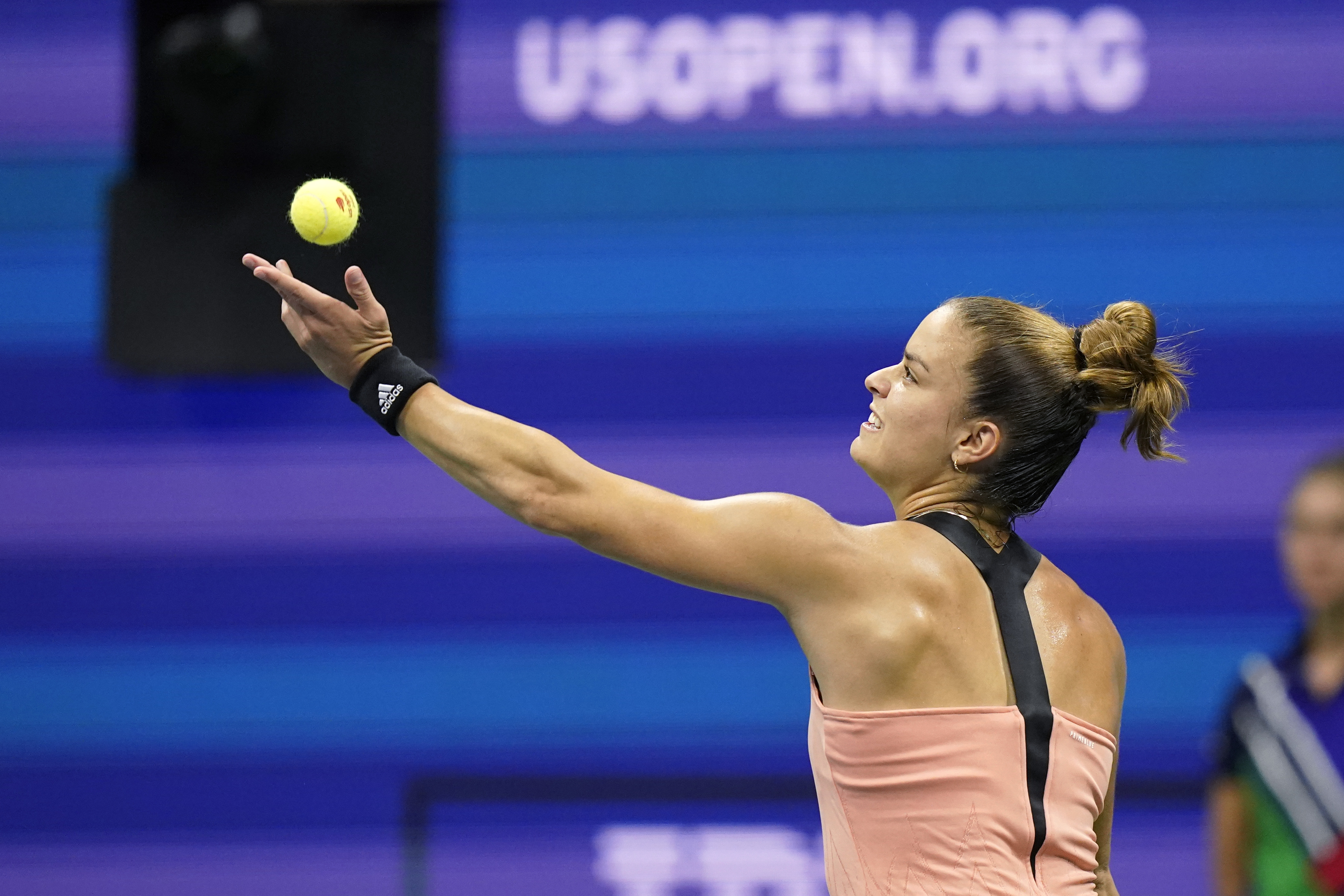 ▲9月8日,希腊选手萨卡里在比赛中发球。当日,在2021美国网球公开赛女单四分之一决赛中,希腊选手萨卡里以2比0战胜捷克选手普利斯科娃,晋级四强。 新华社/美联