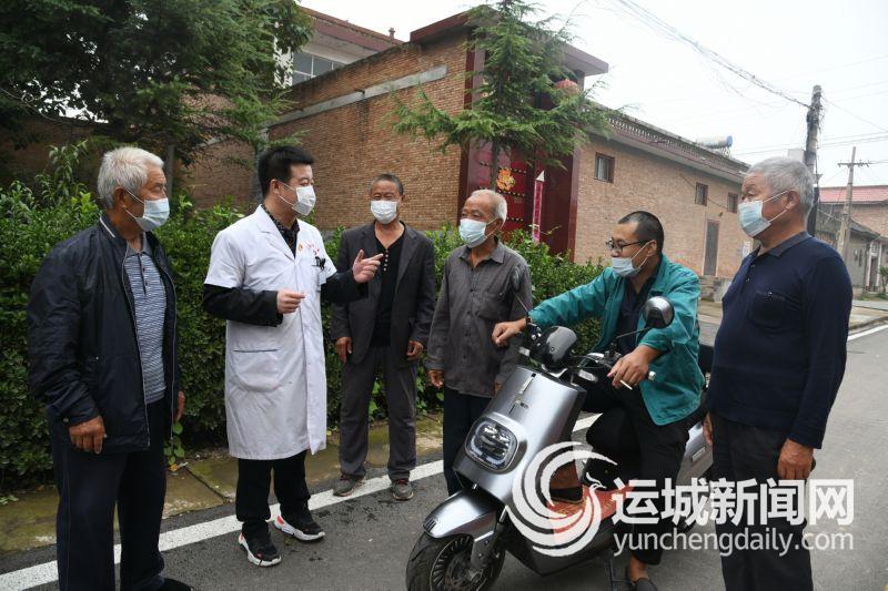 ▲9月8日,闻喜县桐城镇金家庄村医疗卫生室医生曹峰玮向村民讲解秋冬季防疫知识。