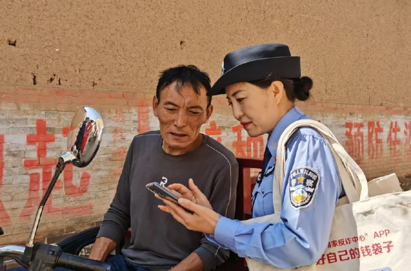 当天,在万荣县后土广场,志愿者和民警通过摆放展板、发放宣传单、分队入户等形式,宣传反电诈,引导群众下载注册“国家反诈中心”APP(上图)。市反电诈中心副主任王军现场为群众讲解如何防范此类电信诈骗的知识。