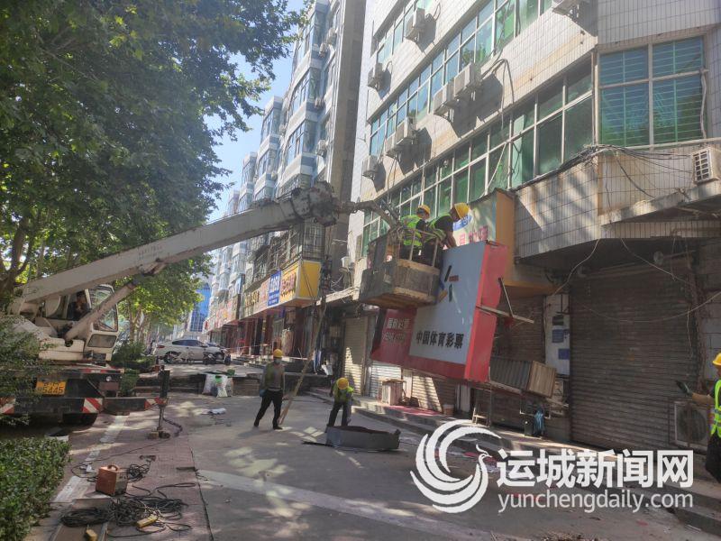 9月11日,在市区中银南路,市城市管理综合行政执法队中片区十五中队执法人员,一方面组织施工人员和设备,对临街立面的破旧广告牌匾进行拆除;另一方面,按照高标准、高质量的要求,对已完成拆除工作路段的临街立面进行提升改造。