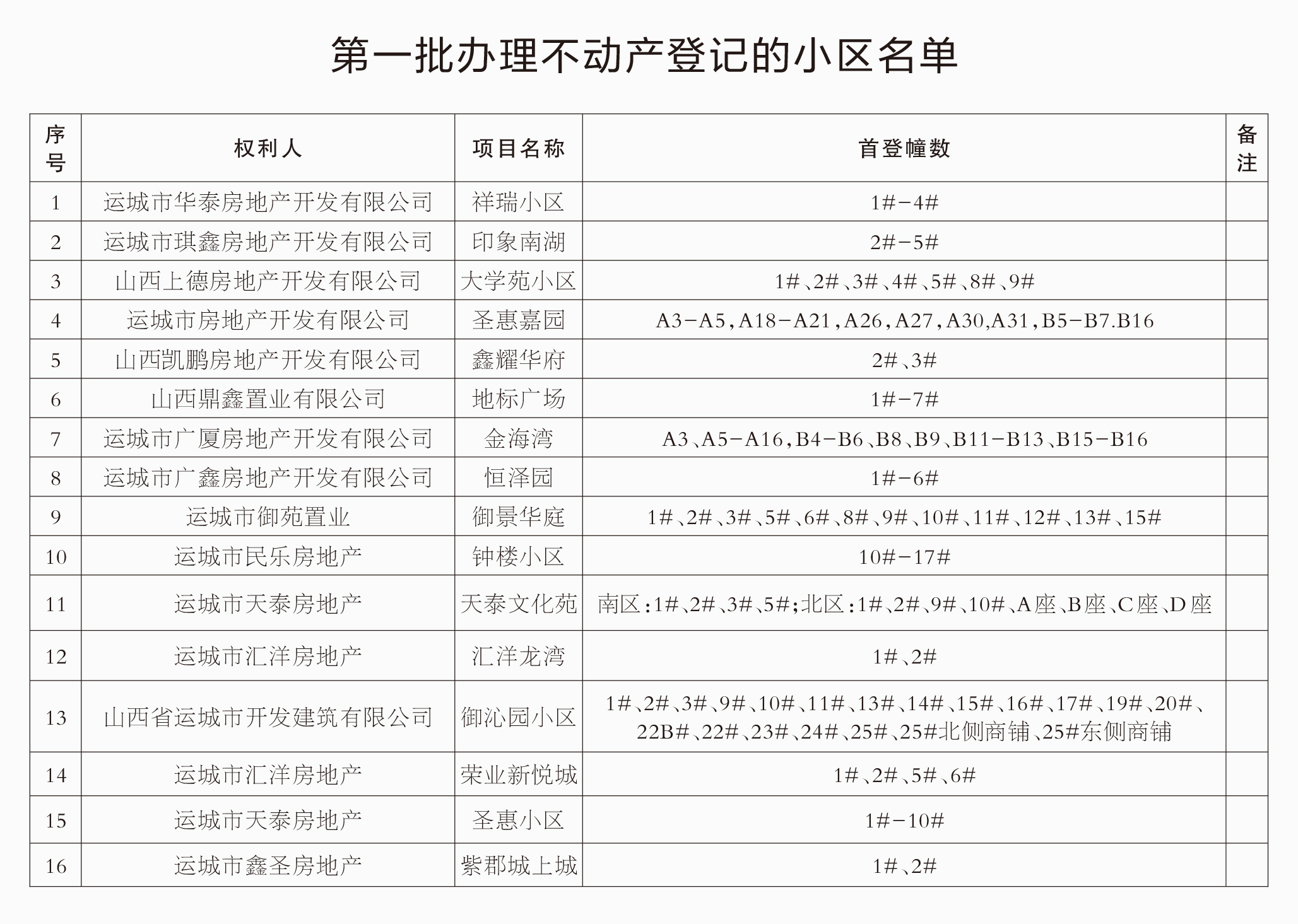 开展房屋产权登记确权颁证清零行动是省委省政府、市委市政府“我为群众办实事”重要安排部署之一,是为群众和企业“办好一件事”的重要举措之一,是化解群众急难愁盼问题的具体行动。现将市本级(中心城区)已办理不动产首次登记小区名单公告如下(见附表),请公告名单中的小区业主尽快与开发商联系,主动协同开发商企业向不动产登记机构共同申请办理不动产转移登记。同时,开发商企业要主动配合购房人办理不动产登记手续。