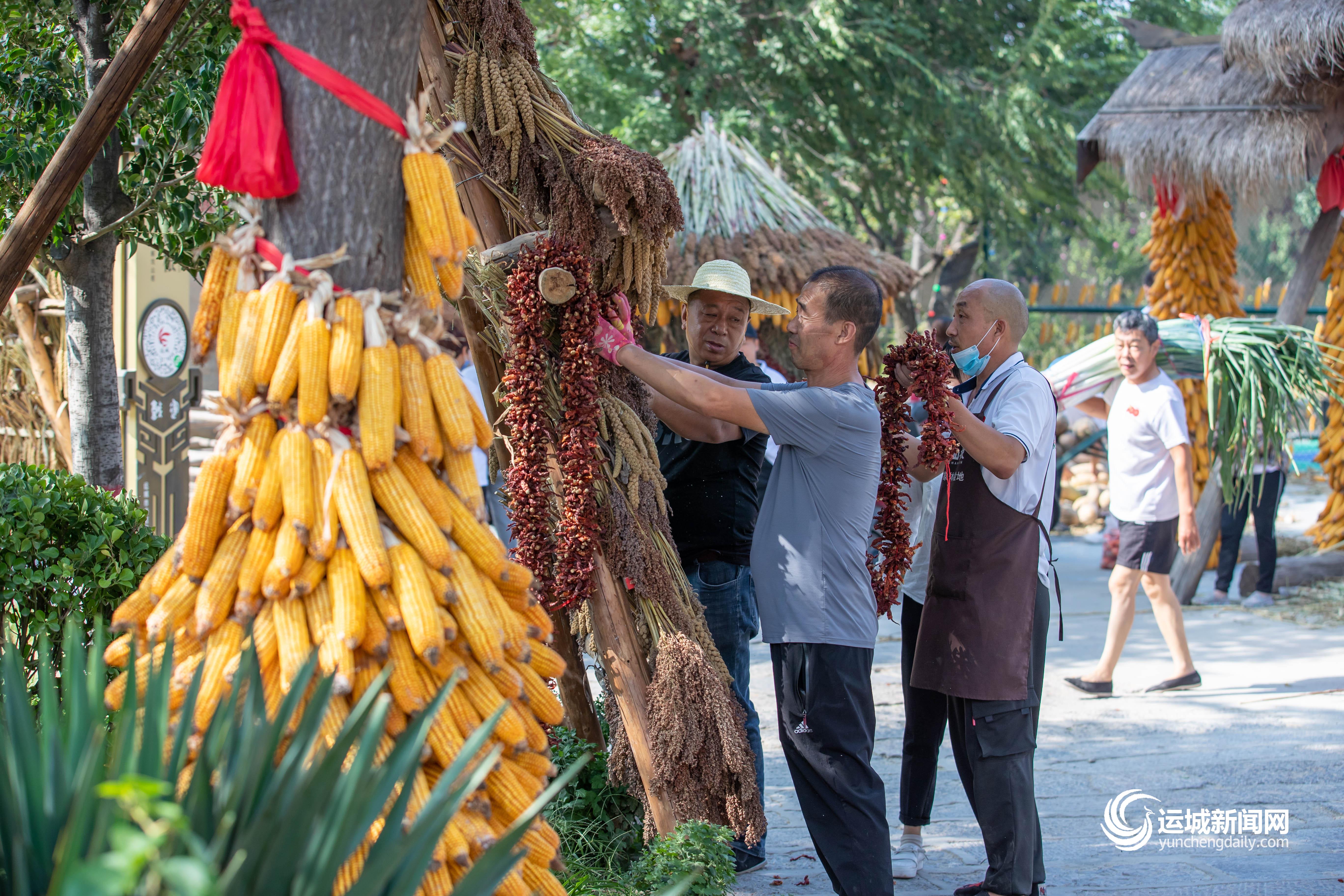 黄灿灿的玉米、沉甸甸的稻谷……工作人员利用这些果实,装点景区的各个区域。景区入口处的大门,经过工作人员细心装点,披上了金黄色的节日盛装,“2021·中国农民丰收节运城主会场”几个大字分外醒目,彰显了本次活动的主题,营造了暖意融融、喜庆丰收的浓厚氛围。