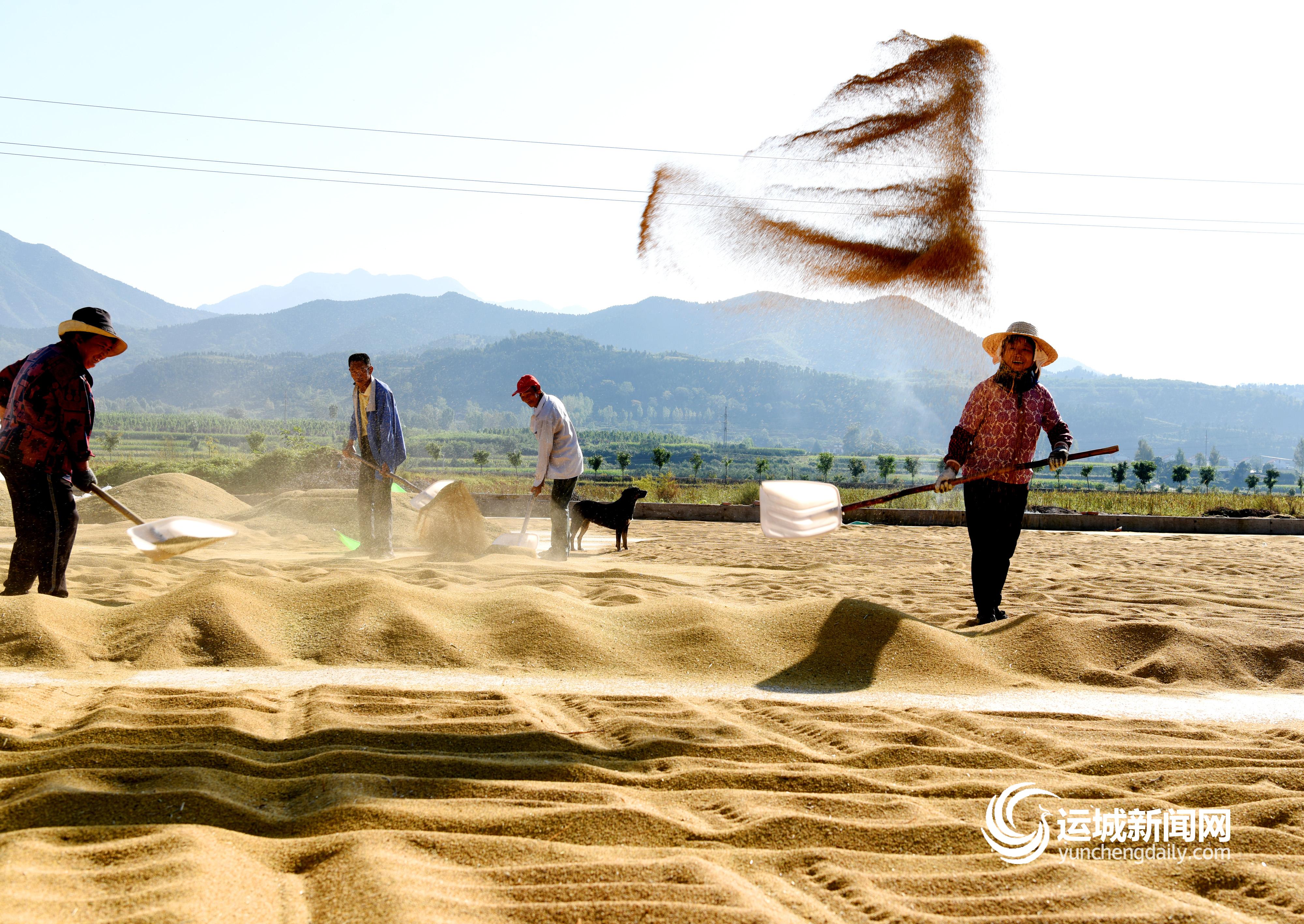 9月13日,垣曲县历山镇一家种植合作社社员在晾晒谷子。