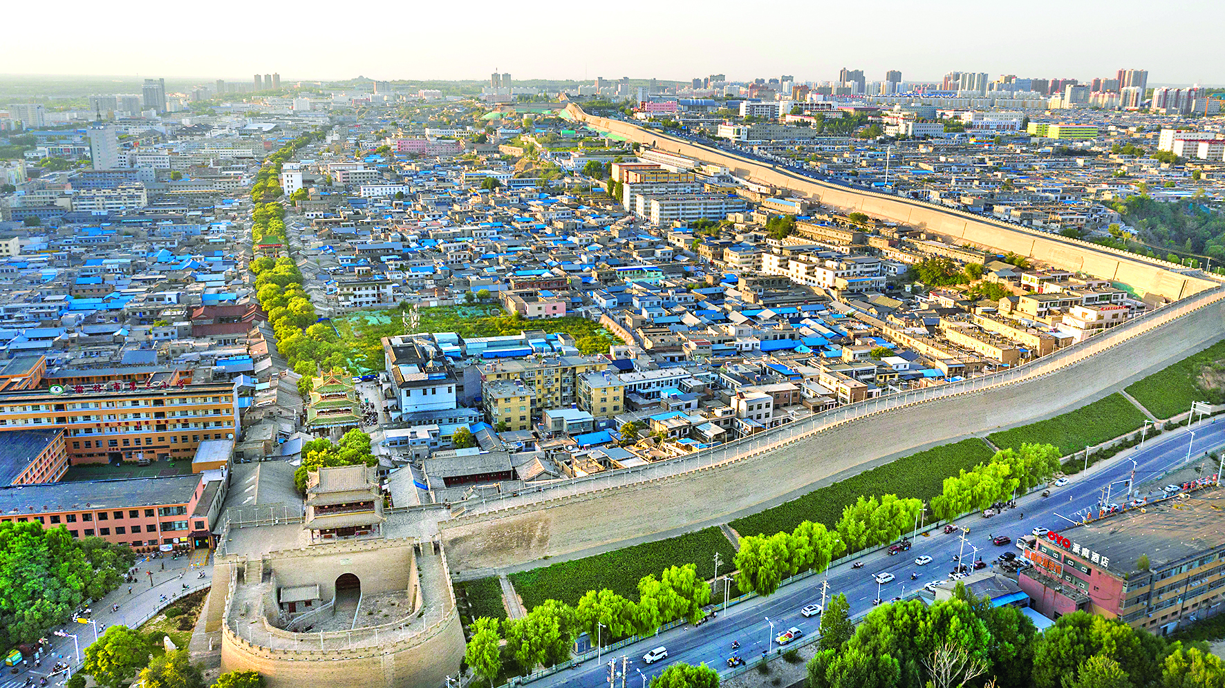 ▲榆林市老城区及城墙(9月11日摄,无人机照片)。榆林建城历史悠久,老城至今仍被古城墙围绕着。