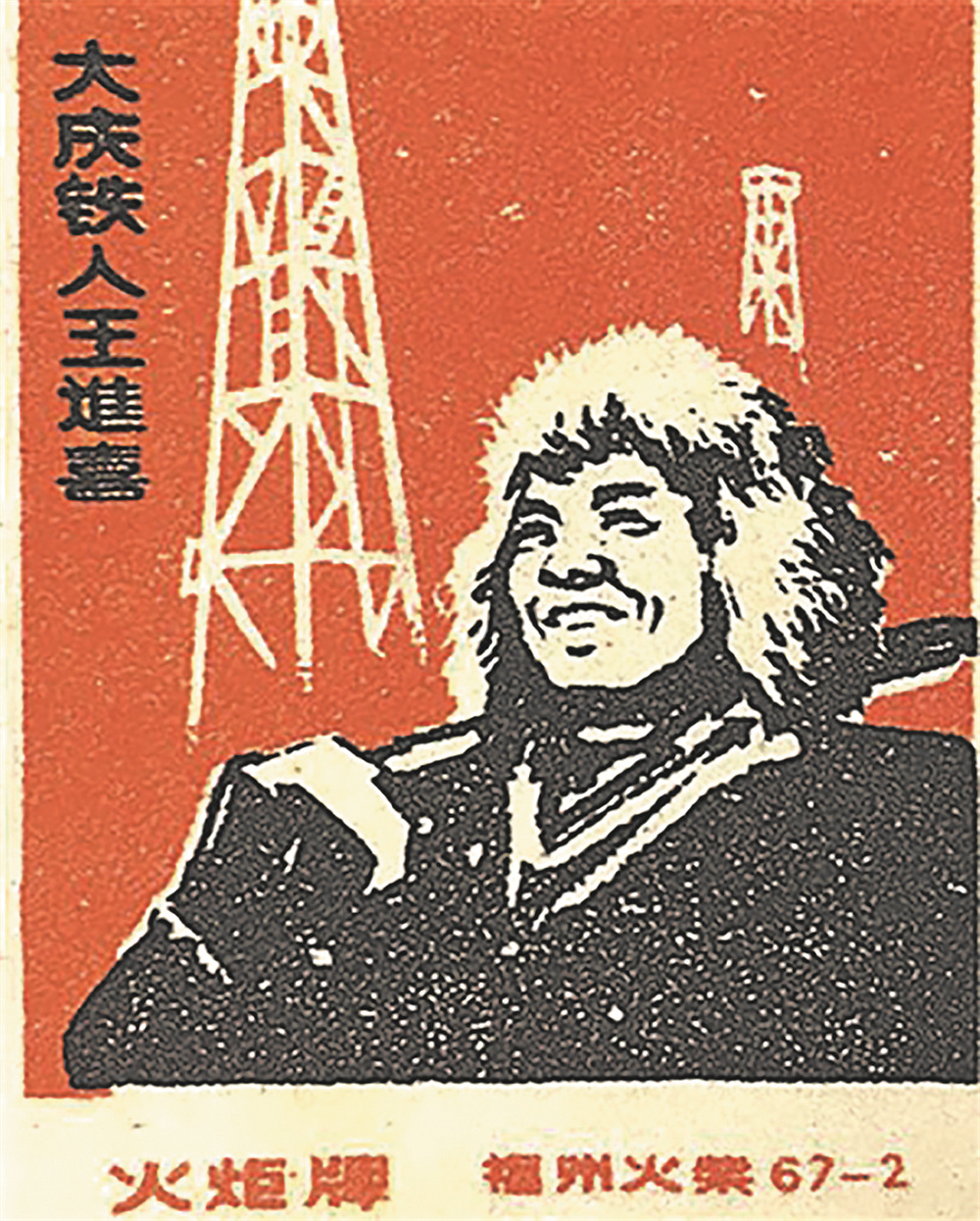 国产烟草企业、火柴企业曾为王进喜出品过主题烟标、火花。20世纪60年代,福州火柴厂出品的“大庆铁人王进喜”火花(下图),描绘了头戴棉帽、身穿棉袄的“铁人”王进喜,在高高井架旁意气风发的形象。此后的90年代,海林卷烟厂出品的“铁人”烟标,主副版图案均是王进喜身穿皮袄,手握刹把,目光坚毅巍然挺立的花岗岩雕像。这尊矗立于大庆市铁人王进喜同志纪念馆前的雕像,形象地再现了“铁人”王进喜的忘我拼搏精神。