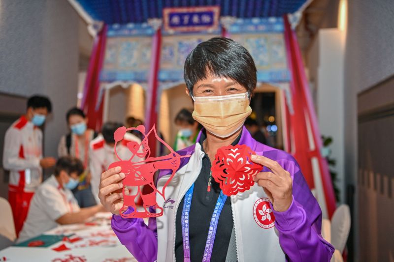 全运村里的非物质文化遗产展厅,集纳了剪纸、刺绣、皮影、面塑等数十种陕西民间艺术展品。全运会期间,成为运动员村里的网红打卡地。中秋前夜,这里又记录了陕港澳运动员共庆佳节的美好时刻。在展厅内的微型戏台,运动员们戴上各类秦腔盔头,摆上造型,玩起了自拍。“感觉这里(陕西)很有特色,有着悠久的历史。”香港射箭队运动员马兴健说。