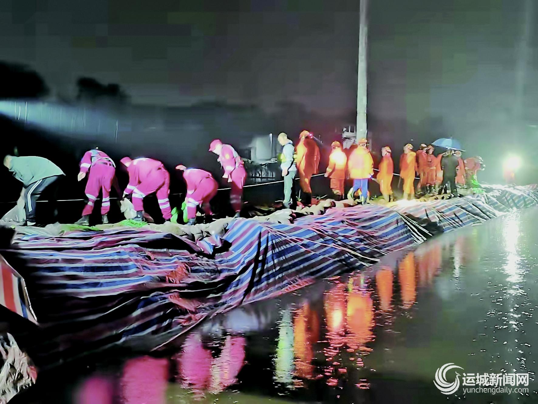 ▲10月6日晚,抗洪人员在汾河新绛段加固堤坝。