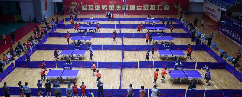 10月2日,“奔跑吧·少年”2021年运城市青少年乒乓球比赛在运城市体育馆开赛。此次比赛为期3天,来自我市各县(市、区)的130名运动员分甲乙丙3个组别11个小项进行激烈角逐。图为青少年选手在比赛上激烈角逐。记者 闫 鑫 摄