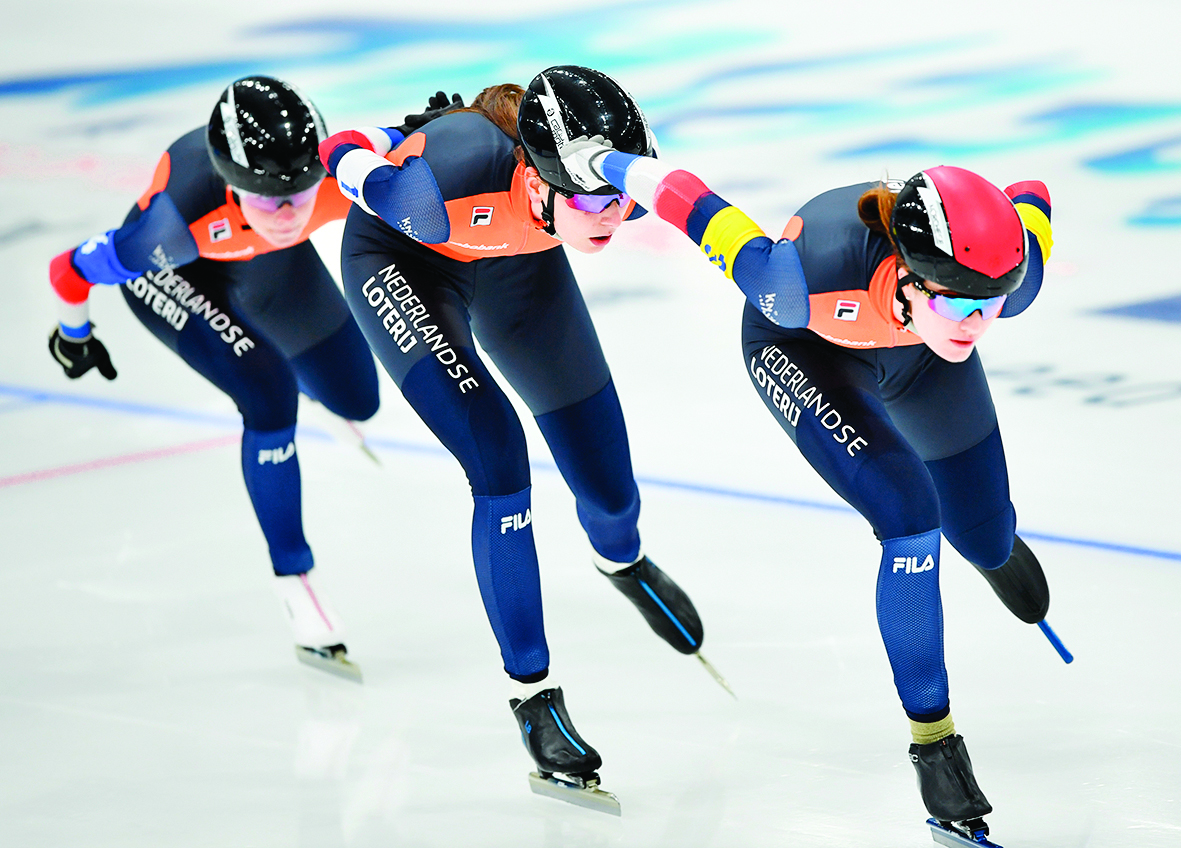 10月9日,荷兰队选手苏菲·克莱伊维尔德、莱昂妮·巴特斯和伊莎贝尔·格雷维特(从左至右)在女子团体追逐赛中,她们以3分15秒64的成绩获得第一名。