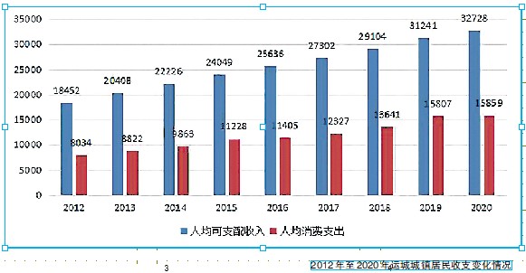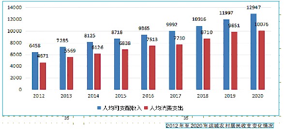 从城镇看,这一时期国家出台了最低工资标准政策,提出了企业工资指导线,强调千方百计增加财产性收入,发放并上调居民养老金,多次上调机关事业单位职工工资,这些政策的实施助推运城市城镇居民家庭人均可支配收入从2012年的18452元,增长到2020年的29104元,增长57.7%,年均增长7.9%。