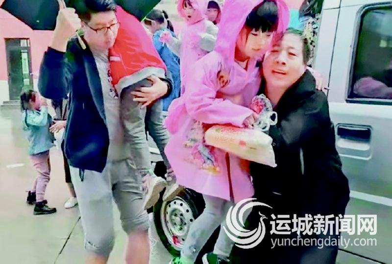 到6点30分左右,卫锐霞和校委一班人全部赶到校门口,教师、保安也迅速到位,在大路口、校门口等各关键路段等候。这时的雨也是越来越大,积水越来越深,学校派出车辆,在大路口至校门口百十来米积水严重的两条路段往返,一次又一次接送学生(上图)。几名学生家长见状,也纷纷开上自己的车加入接送队伍。到8时许,教务处统计显示,全体师生均安全入校。