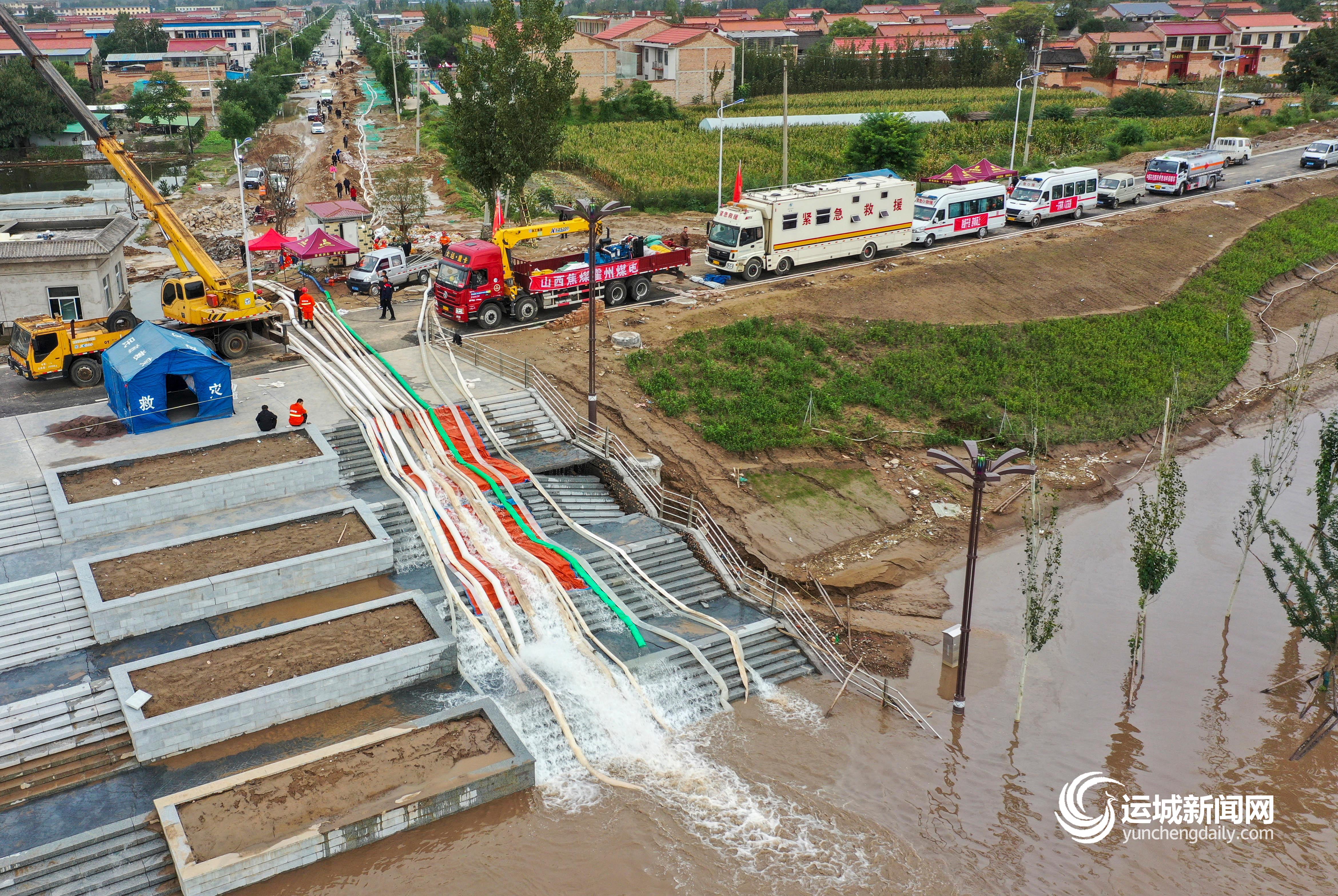 10月10日,在新绛县汾河大坝,救援团队在加紧排水。