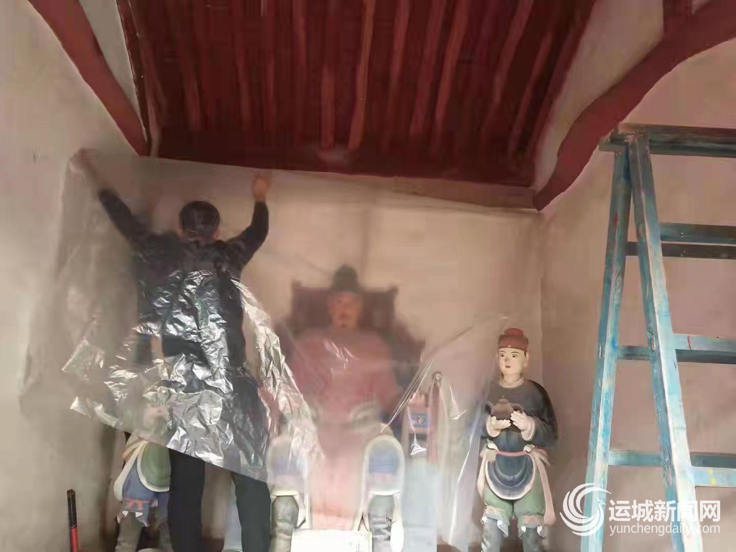 解州关帝庙工作人员为塑像遮盖塑料布,以防止其受雨水侵蚀受损。