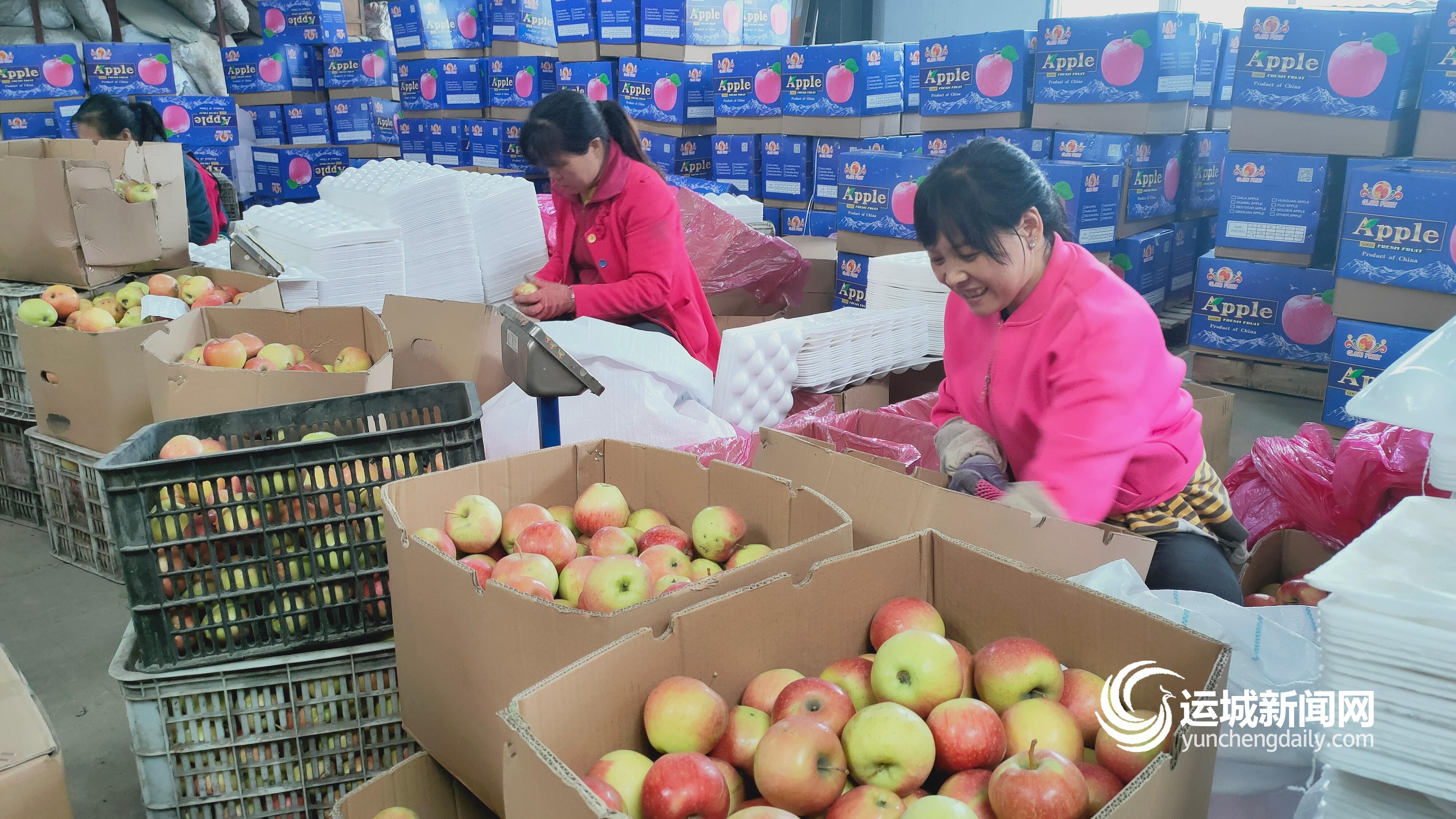 ▲平陆县金童果业专业合作社工作人员将苹果装箱 记者 陶登肖 摄