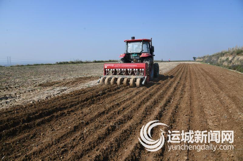 10月18日,闻喜县后宫乡上院村的麦田里,农机在播种小麦。
