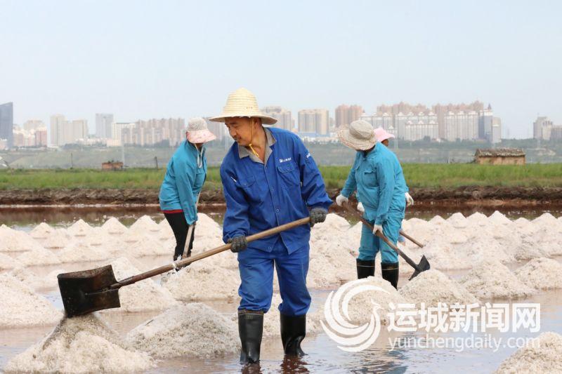 从2018年开始,随着每年夏季气温的升高,运城盐湖就会出现一群身穿蓝色工作服的工人,他们手持铁锨,采用隋唐时期的“五步产盐法”在盐池中铲收原盐,成为盐湖的一道独特风景。