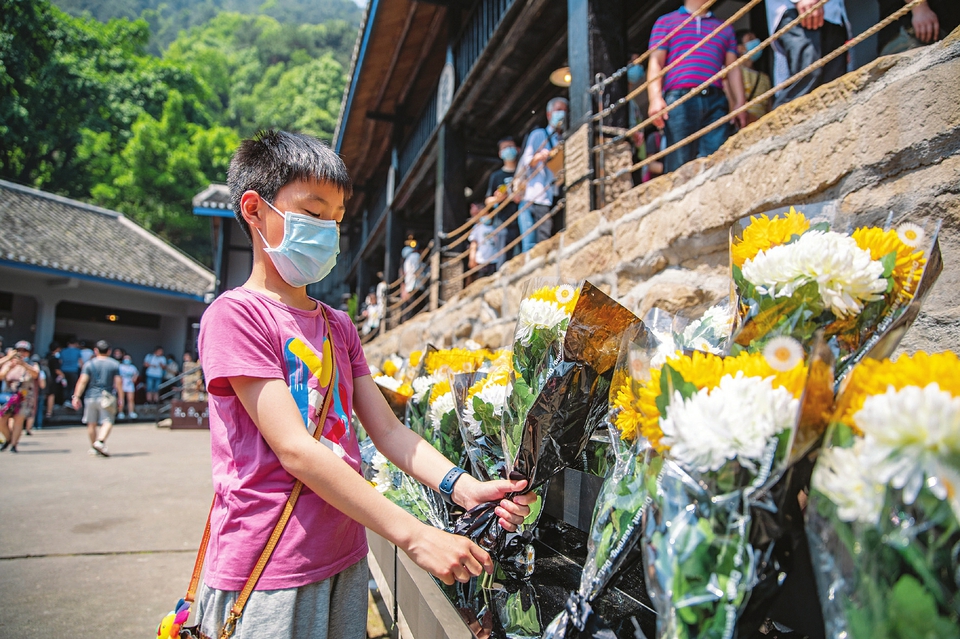 在重庆渣滓洞看守所旧址景区,游客为烈士献花(五月一日摄)。新华社记者黄伟摄