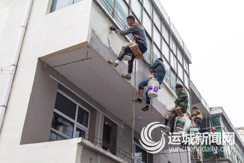 10月19日,工人在盐湖区棉麻公司上世纪80年代建设的家属楼楼体上实施外墙改造粉刷。