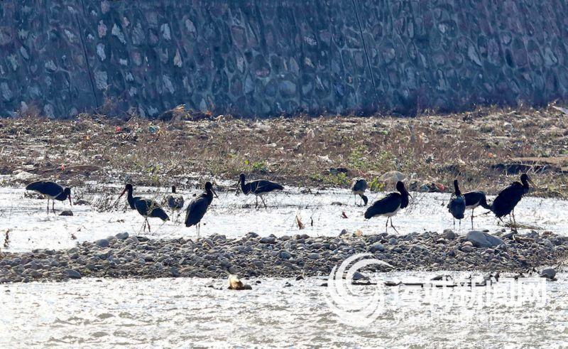 10月16日,30余只国家一级保护动物黑鹳现身垣曲县亳清河皋落段。