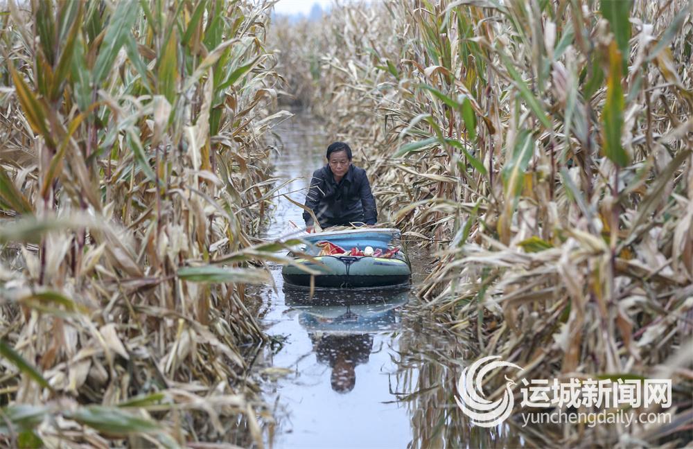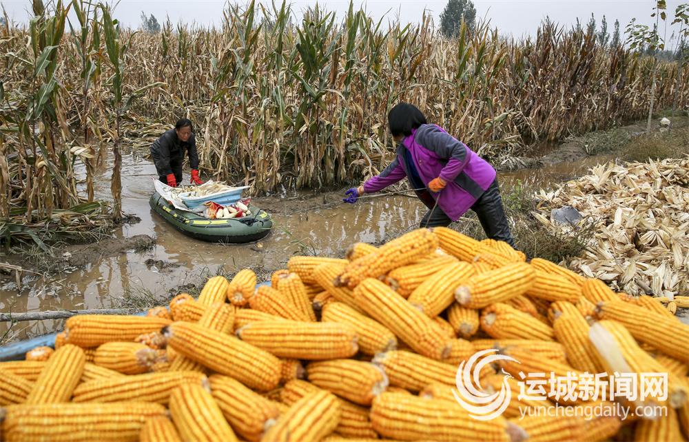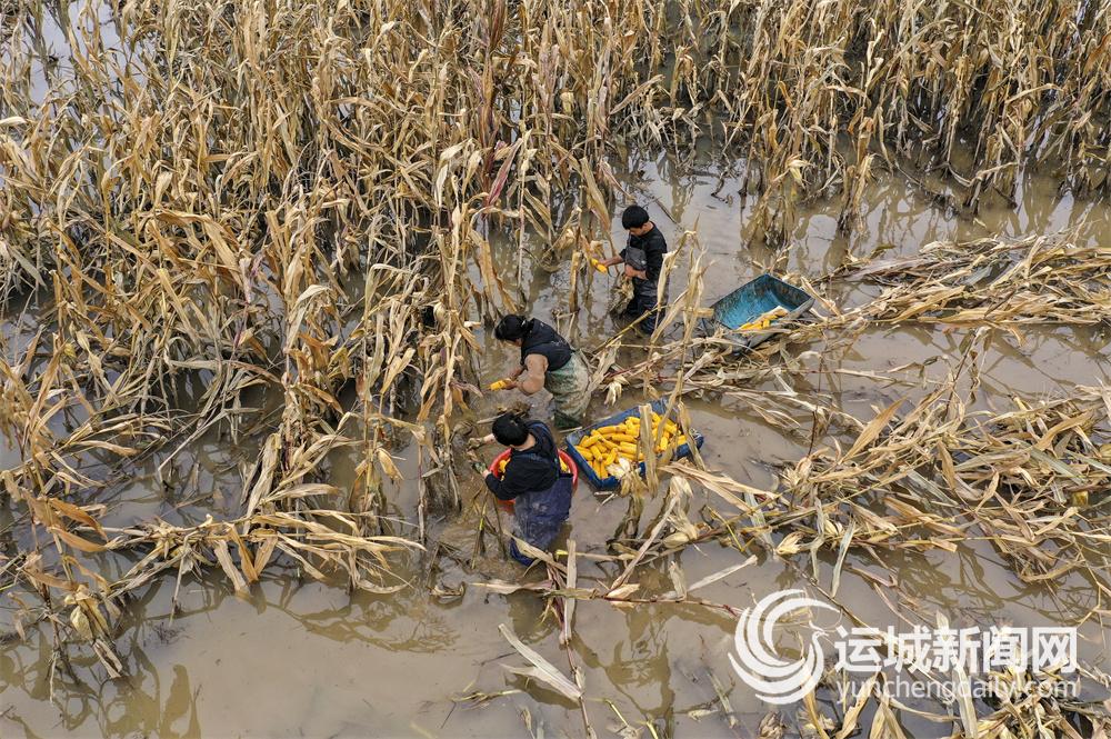 ▲稷山县稷峰镇管村农民赵建平夫妇,在水淹地里抢收成熟的玉米。