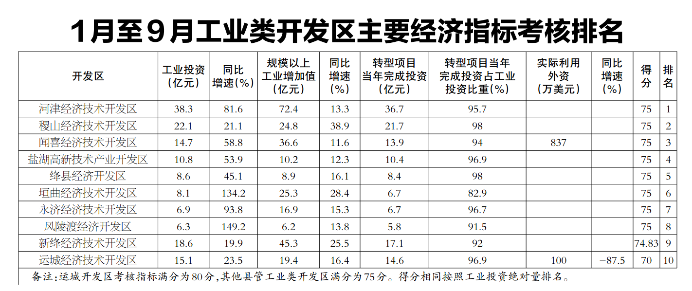 1月至9月工业类开发区主要经济指标考核排名