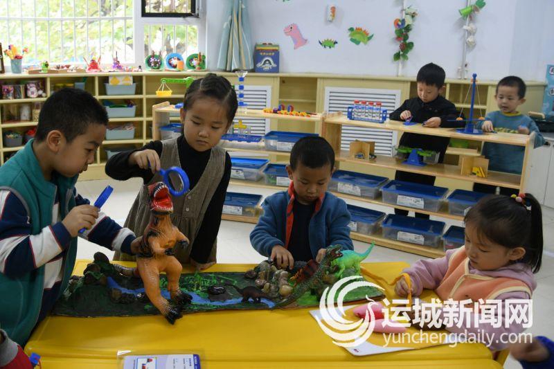 10月25日,闻喜县海天新教育幼儿园大班的小朋友正在观察恐龙模型。