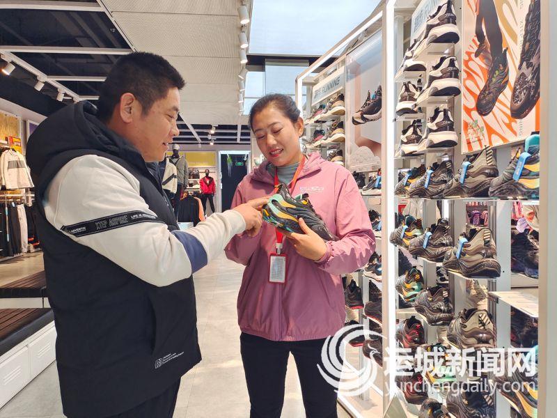 特步专卖店店员向消费者介绍跑鞋设计亮点