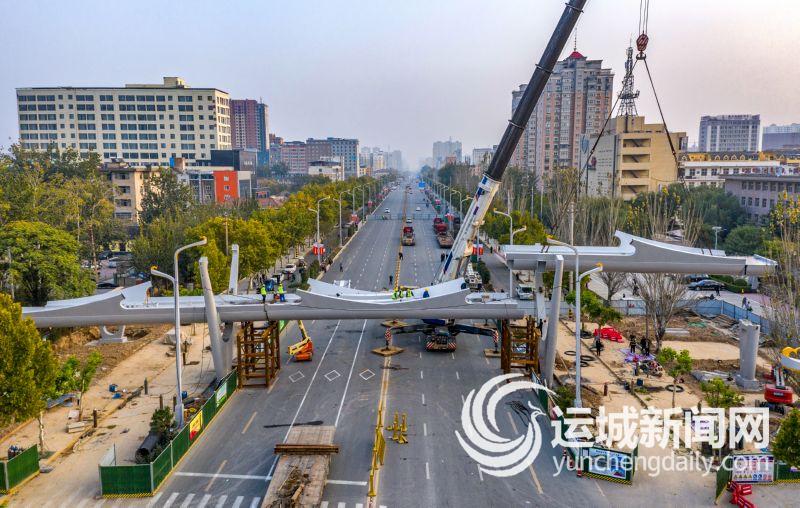 ▲10月30日,在市区解放路示范学校人行天桥建设现场,施工人员在吊装桥梁。